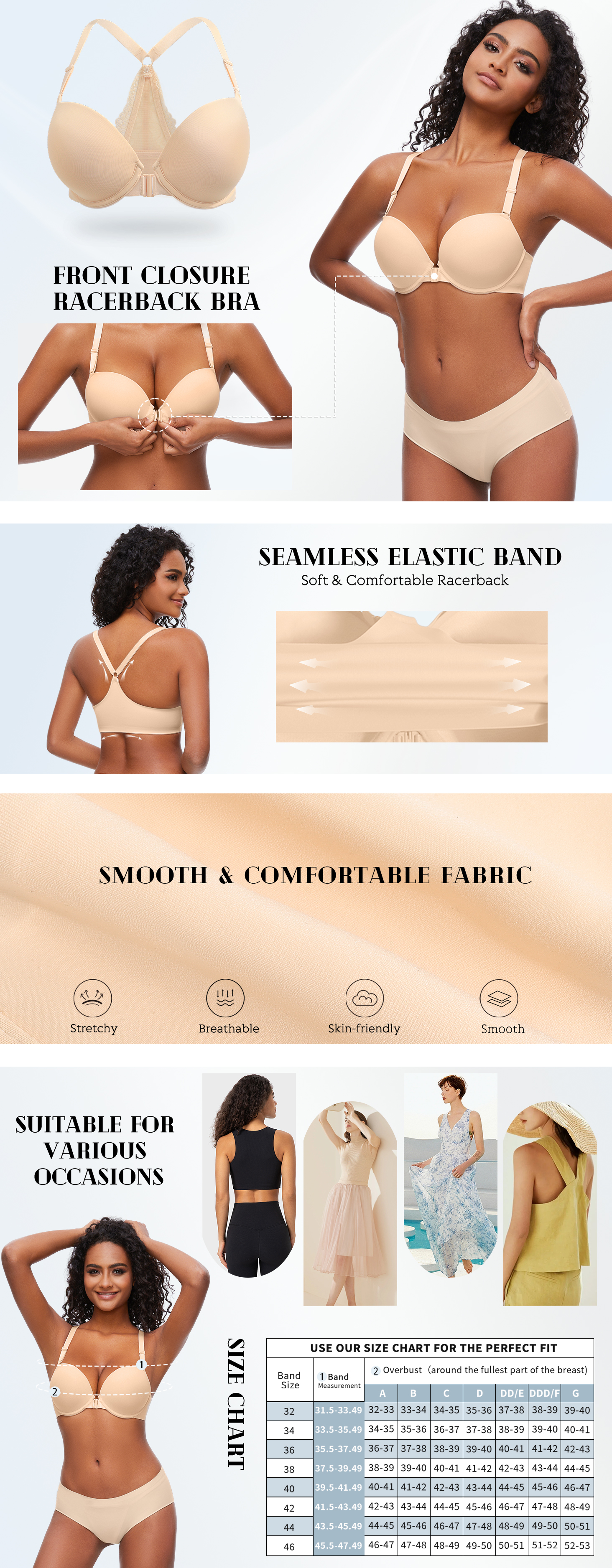 Front Closure Push Up Padded Seamless T Back Thin Straps Underwire Bra