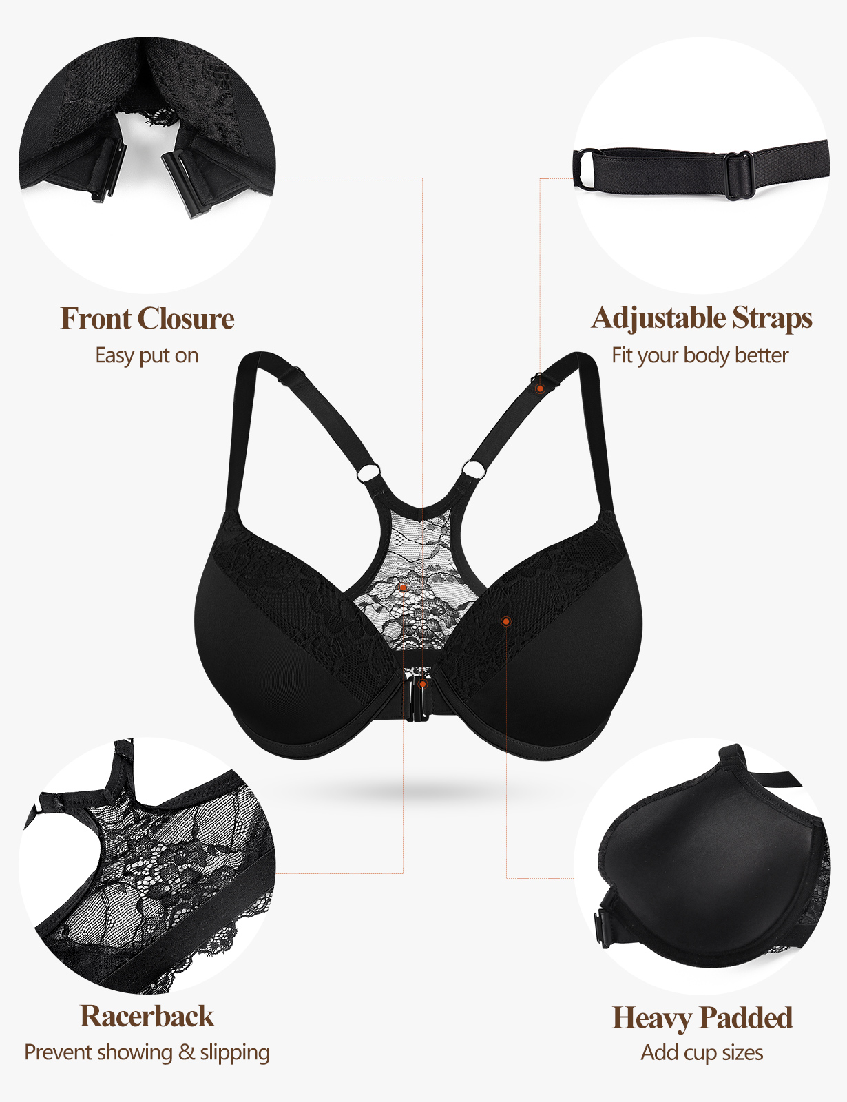 Front Closure Racerback Push Up Bra Super Padded Lace Underwire Bra
