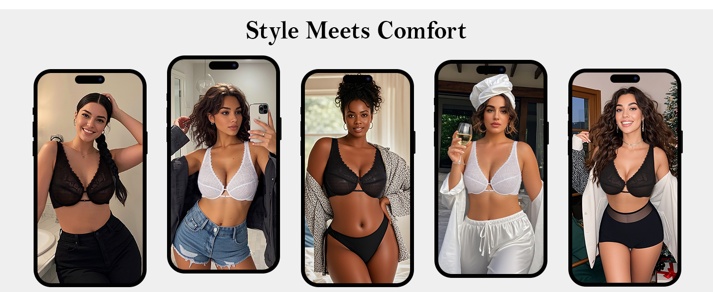 Sheer Mesh And Lace Full Coverage Plunge Unlined Underwire Bra